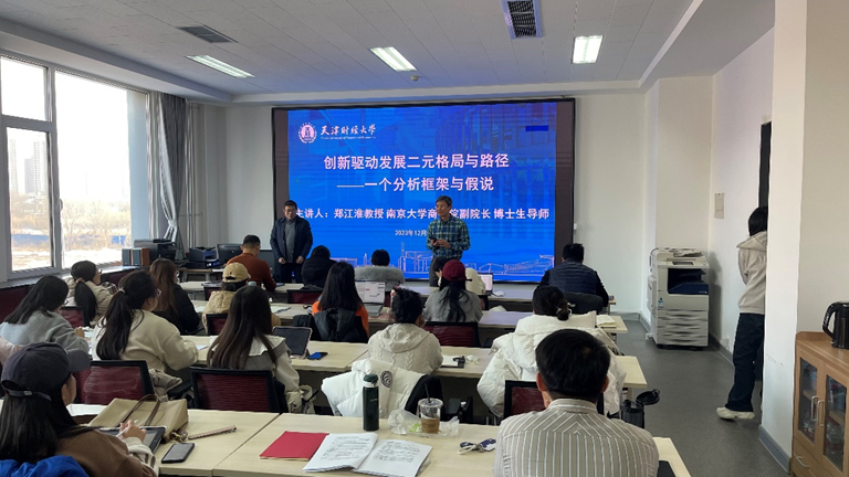 郑江淮教授基于新时代人才强国战略背景引出讲座主题,以阿瑟·刘易斯的“二元经济论”为分析框架,讲授了技术引进阶段、技术前沿上创新驱动的“二元经济发展”以及区域技术互补下的创新发展格局。讲座中郑江淮教授深入分析了创新发展中的创新概念,如何区分以及怎样衡量等一系列问题,值得大家进一步深入思考。讲座结束后,与会师生与郑教授进行了深入的讨论,郑教授详细解答了区域创新体系建设、发明人才配置、中高端技术产业发展等重要问题,与会人员表示受益匪浅。
