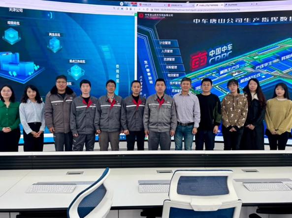 调研团队深入不锈钢车体、组装等主要生产线,充分了解企业生产流程、工艺革新、智慧管理、产能产量、园区配套以及轨道交通装备产业链工作开展情况,参观了数字化生产指挥舱,天津中车唐车轨道车辆有限公司工会主席张树春、数字化改革办公室副主任张佳和技术主管张谦对公司现有数字化管理系统进行了详细介绍,包括生产指挥中心、物流调度指挥中心、数字化调试平台等。