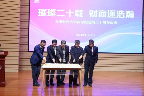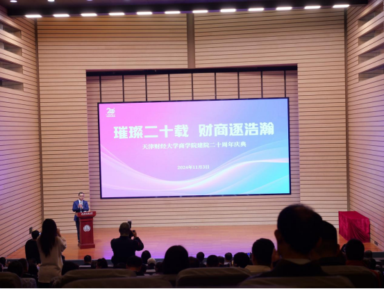 成功举办“璀璨二十载,财商逐浩瀚”建院20周年庆典暨数智时代新商科发展论坛。天津市社科联专职副主席袁世军、校党委书记赵鸣、副校长韩少波,以及兄弟院校代表、合作单位代表、海角社区