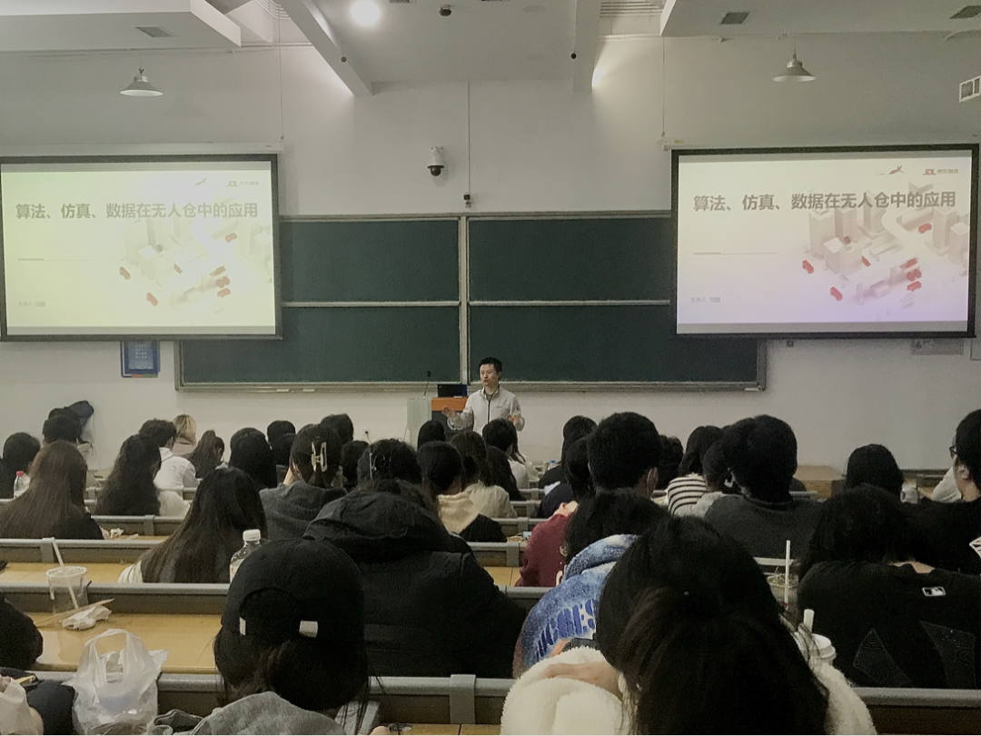 范博士为同学们讲解了算法、仿真、数据在无人仓中的具体应用,讲述了智能仓储中的选品、储存、拣选算法、基于“顺风车”模型的设备调度算法以及数据分析与挖掘在无人仓中的价值与应用。同时,他还分析了物流专业海角社区