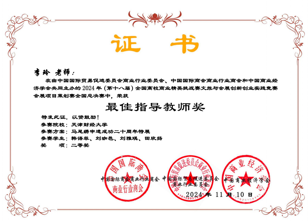 韩语菲、刘珈邑、刘雅琪和田欣扬组成的团队在李玲老师的指导下,凭借其出色的项目《山青水绣,马尾生花——马尾绣申遗成功二十周年特展》荣获全国总决赛二等奖。指导老师李玲获“最佳指导教师”称号。