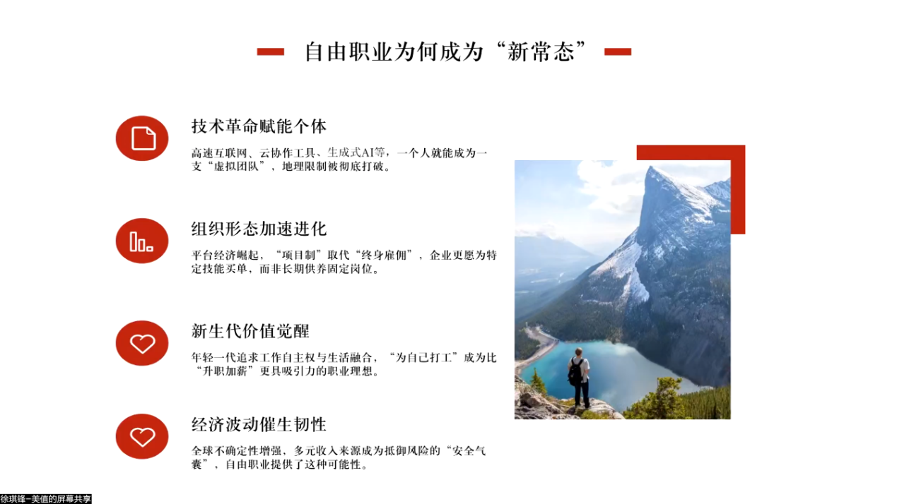 、美值科技创始人徐琪锋,以“自由职业创业:时代趋势下的进阶路径与现实考量”为主题分享。他结合自身从校园兼职积累资源到毕业后创业的经历,提出校园能力积累“六多”原则,拆解“超级个体”成长关键与“一人公司”运营模式,总结“找价值点→做落地产品→签首单→复制商业闭环”的行动路径。