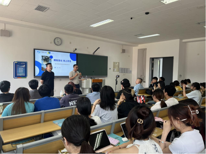 副总经理韩瑜深度剖析了营销行业现状,分享了品牌线上增长闭环的整体思路和实施路径,提炼了依托增长飞轮构建电商全域经营方法论,针对企业实战案例详细解释了新媒体的内容制作、效果广告、内容运营等环节的设计要点,由此给予同学们职业发展指导和行业洞察,并提供了实习和全职工作岗位及参与实践项目的机会,帮助同学们提升专业技能和素养,构建职业网络,以实现学习与就业的无缝对接。