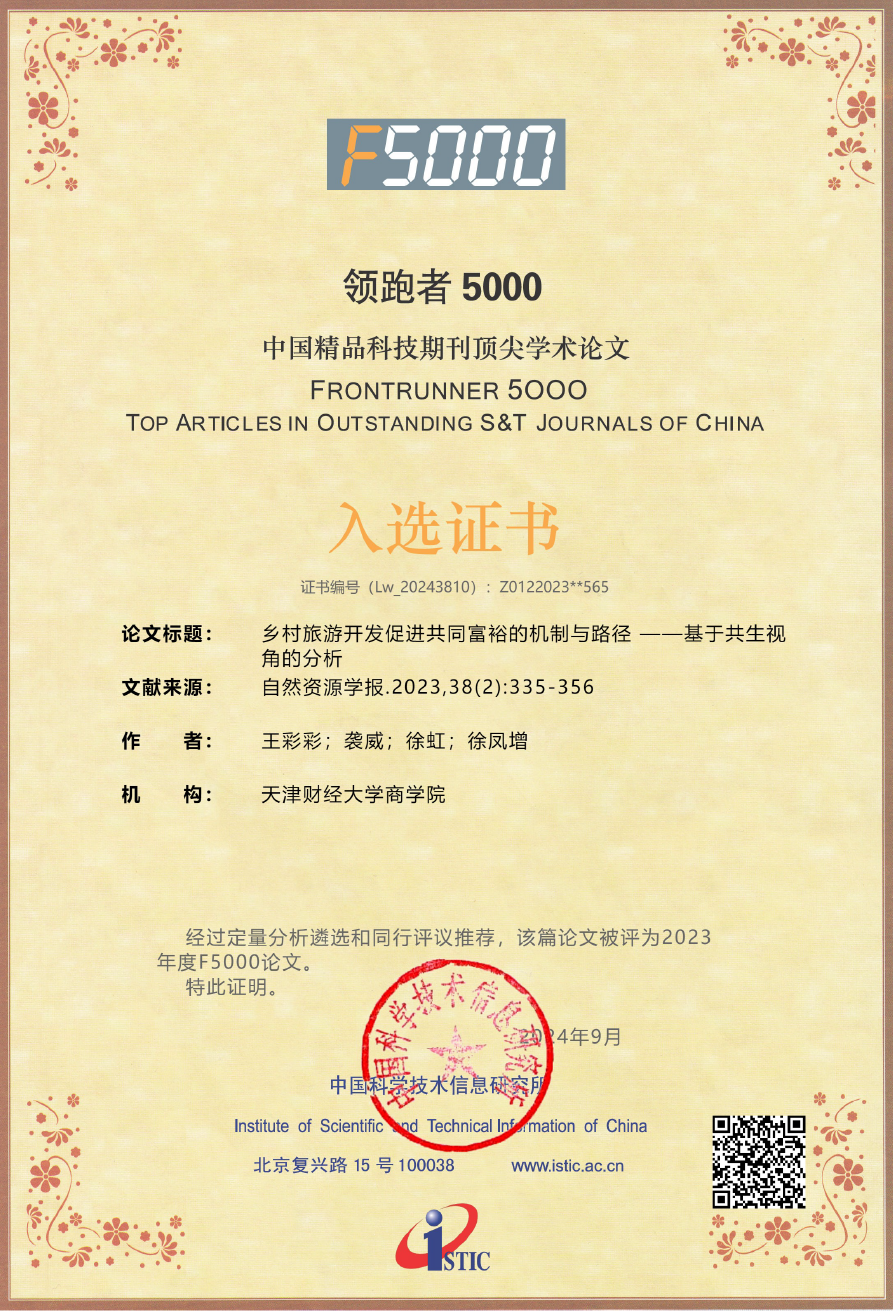 为第一署名单位发表在《自然资源学报》期刊上的“乡村旅游开发促进共同富裕的机制与路径——基于共生视角的分析”一文被评为2023年度F5000论文。
