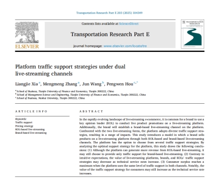 Liangjie Xia, Mengmeng Zhang, Jun Wang, Pengwen Hou (2025). Platform traffic support strategies under dual live-streaming channels[J].Transportation Research Part E: Logistics and Transportation Review, 203:104349.