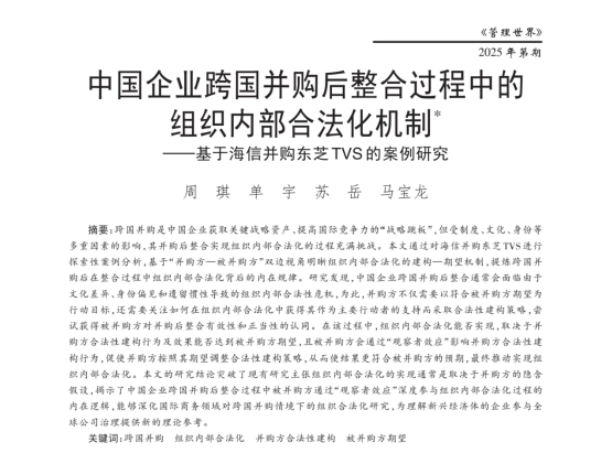 企业管理系周琪博士及其团队在国内管理学顶刊《管理世界》发表学术论文“中国企业跨国并购后整合过程中的组织内部合法化机制——基于海信并购东芝TVS的案例研究”。